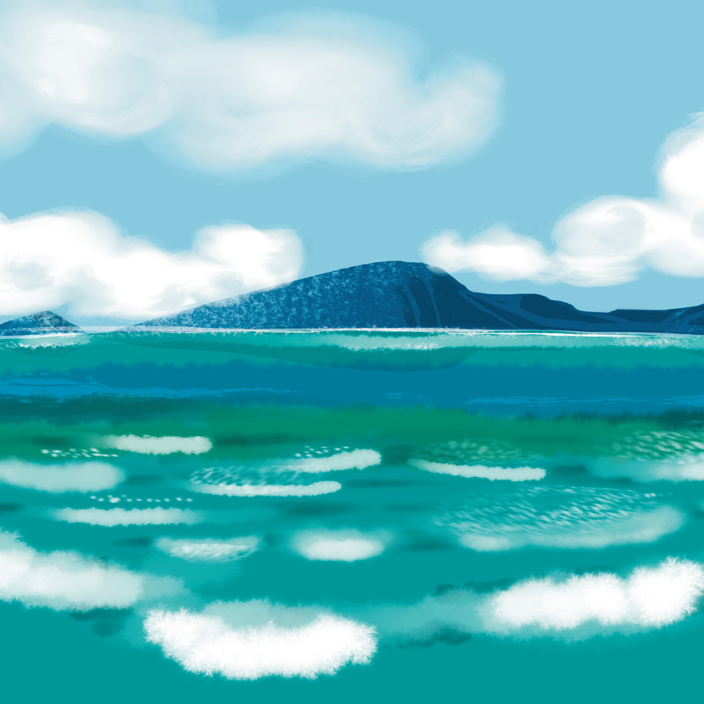 อยากได้ภาพทะเลที่ช่วยฮีลจิตใจ ใช้โทนสีเย็นตามสีท้องทะเล แต่ปรับแต่งสีให้เป็นแนว Illustration เน้นคลื่น ให้ภาพดูมี Movement และเติมความรู้สึกให้สดชื่น มีพลัง